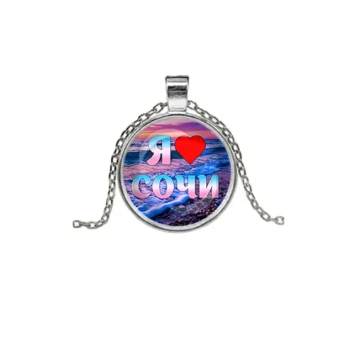 Сувенирный кулон с изображением и надписью «Я люблю Сочи». Изготовлен из бижутерного сплава с покрытием под серебро и стекла.