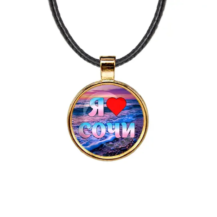Кулон «Я люблю Сочи» — сувенирный аксессуар из бижутерного сплава с золотым покрытием и защитной стеклянной линзой.