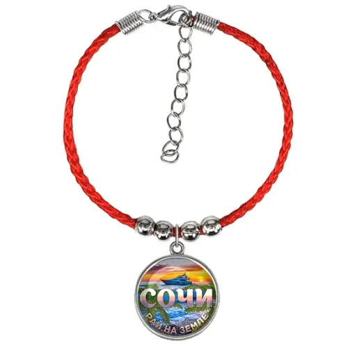 Браслет из красного шнура с декоративным элементом на металлической основе под защитным стеклом.