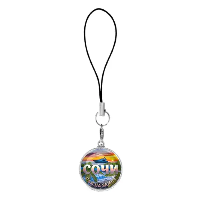 Подвеска-брелок для телефона из бижутерного сплава под серебро. Кулон украшен изображением под выпуклой стеклянной линзой.