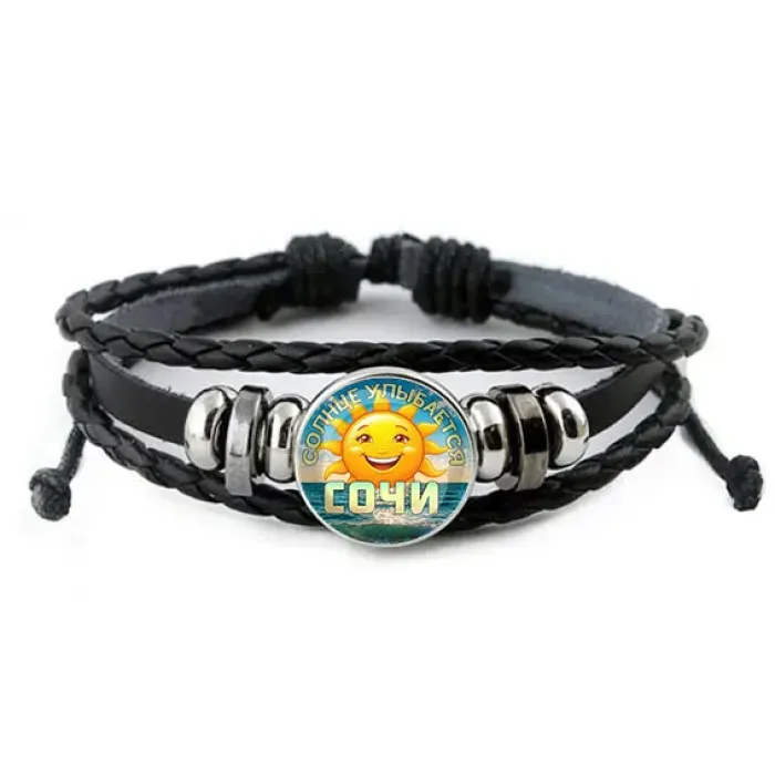 Браслет из искусственной кожи с декоративным элементом в виде солнца под стеклянной линзой.