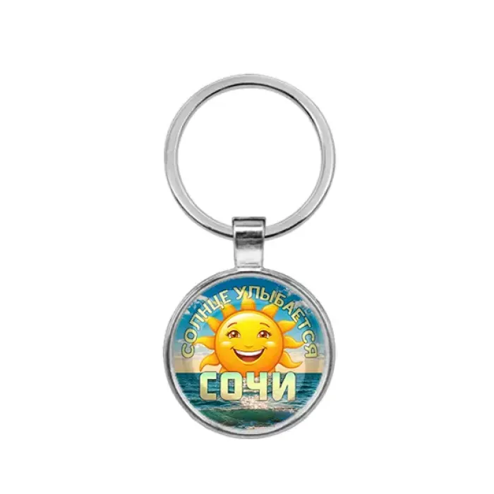 Круглый брелок из бижутерного сплава с изображением улыбающегося солнца под стеклянной линзой.