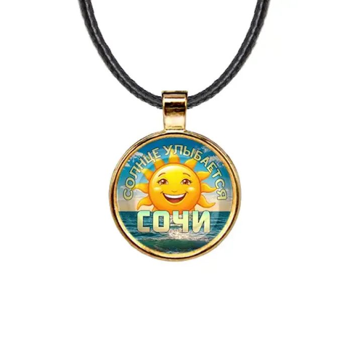 Кулон из бижутерного сплава с золотым покрытием и стеклянной линзой. Дизайн с изображением солнца.