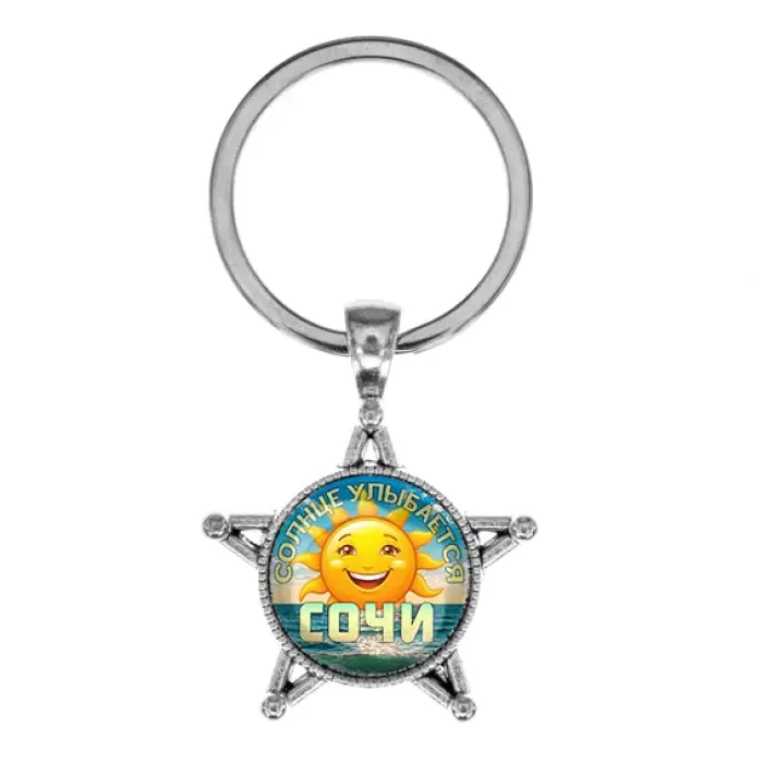 Брелок в форме звезды с изображением улыбающегося солнца. Материал — бижутерный сплав под серебро и стекло.