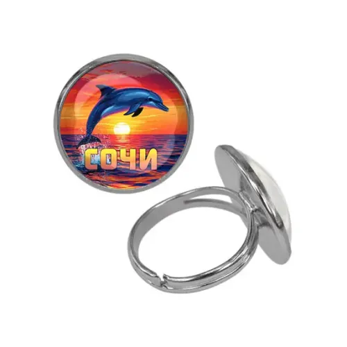 Безразмерное кольцо из бижутерного сплава с изображением дельфина под выпуклой стеклянной линзой.