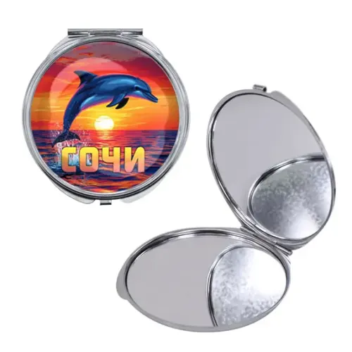 Складное круглое зеркало для косметических процедур из металла и стекла с полноцветной печатью изображения дельфина.