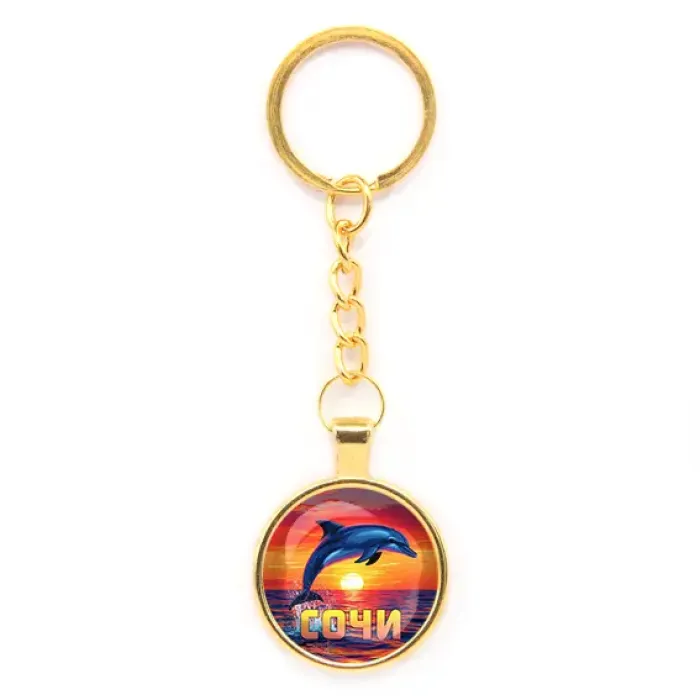 Брелок круглой формы в золотом цвете с изображением дельфина и цепочкой.