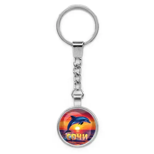Круглый брелок из бижутерного сплава с изображением дельфина под выпуклой стеклянной линзой.