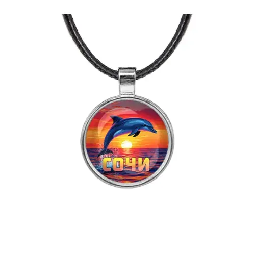 Кулон из бижутерного сплава в виде дельфина с покрытием под серебро и стеклянной линзой.