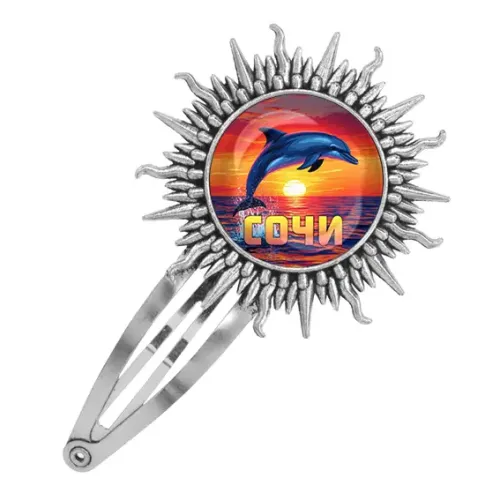 Заколка для волос из металлического сплава в форме дельфина с серебристым покрытием и защитной стеклянной линзой.