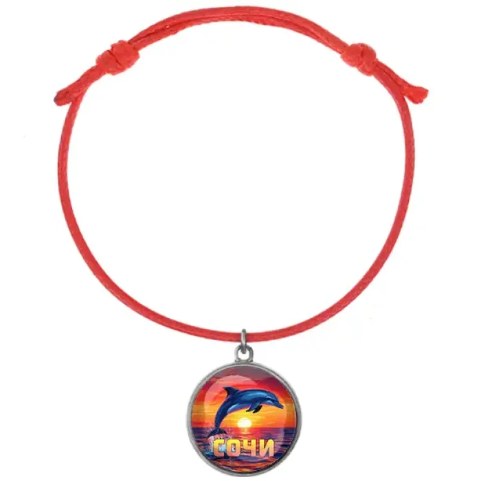 Браслет из шнура с подвеской-сувениром в виде дельфина. Подвеска имеет металлическое основание с полиграфической вставкой под выпуклым стеклом.