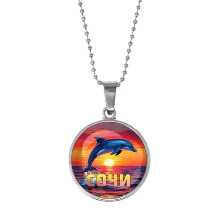 Кулон в виде дельфина из бижутерного сплава с серебристым покрытием и стеклянной линзой.