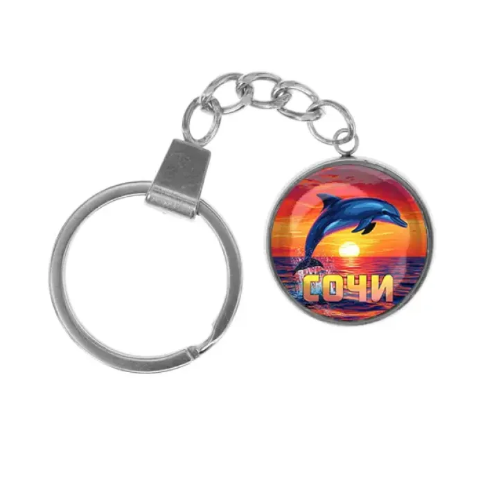 Брелок для ключей из нержавеющей стали с декоративным элементом в виде дельфина под стеклянной линзой.