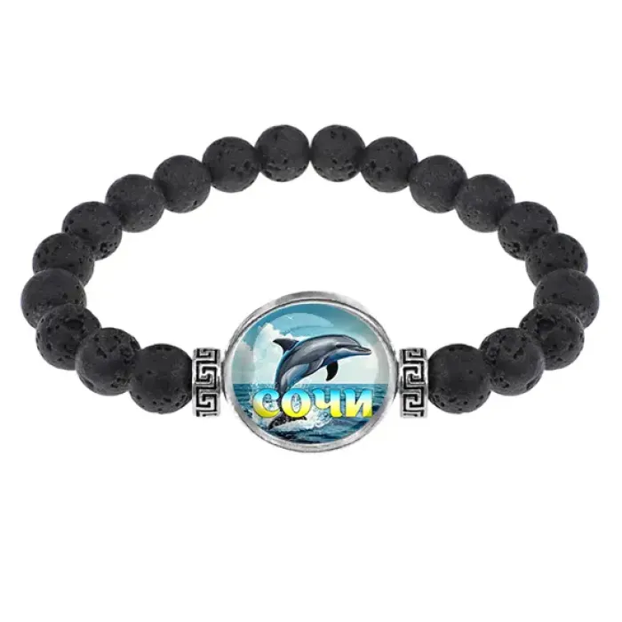 Стрейч-браслет из натуральной лавы диаметром 8 мм с изображением дельфина под выпуклой стеклянной линзой.