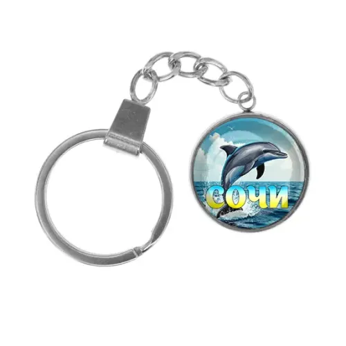Брелок для ключей из нержавеющей стали с изображением дельфина под выпуклой стеклянной линзой.