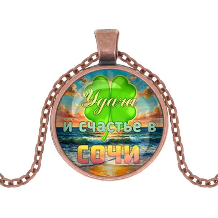 Кулон с символикой удачи из бижутерного сплава с покрытием под медь и стеклянной линзой.