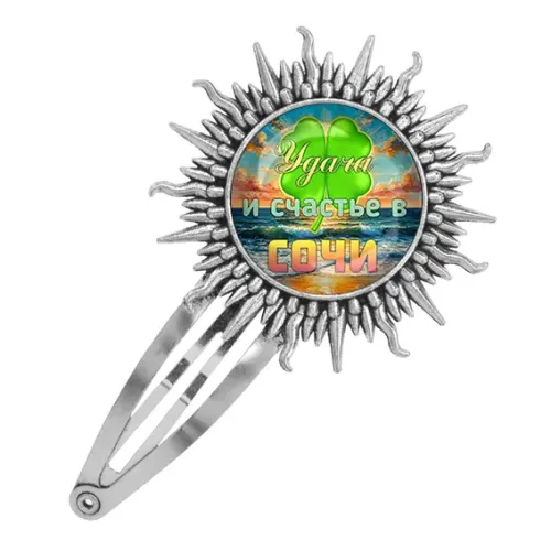 Металлическая заколка-сувенир в цвете серебро с декоративным элементом под стеклом.