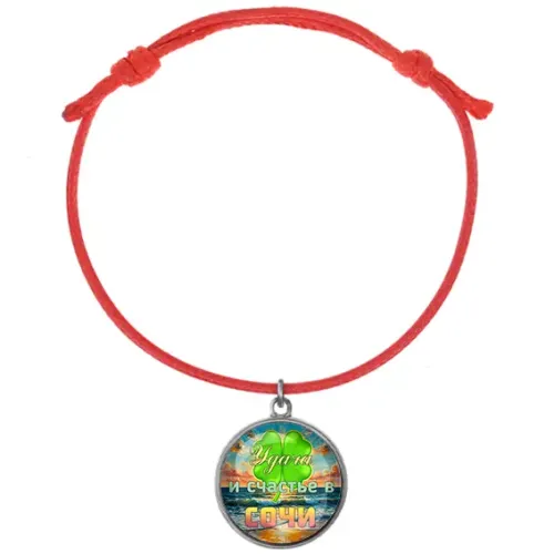 Браслет из красного шнура с металлической подвеской. На подвеске расположена полиграфическая вставка под выпуклым стеклом.