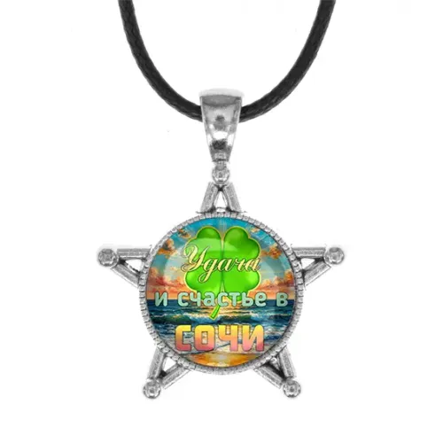 Кулон в виде звезды из бижутерного сплава под серебро со стеклянной линзой.