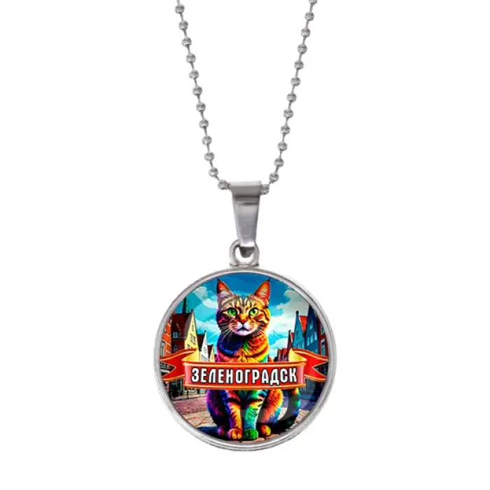 Сувенирный кулон с цепочкой, выполненный в серебристом цвете с изображением, защищённым стеклянной линзой.