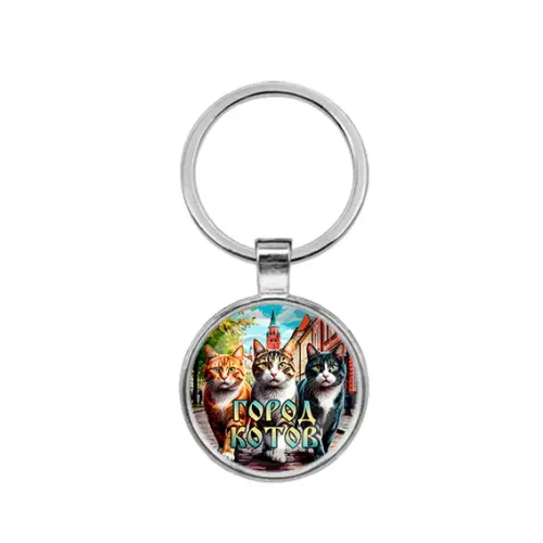 Круглый брелок из бижутерного сплава с серебристым покрытием и стеклянной линзой. Дизайн — «Город котов».