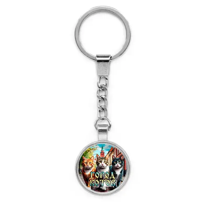 Круглый брелок из бижутерного сплава с серебристым покрытием и стеклянной линзой. Дизайн «Город котов».