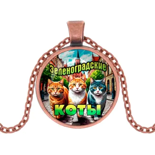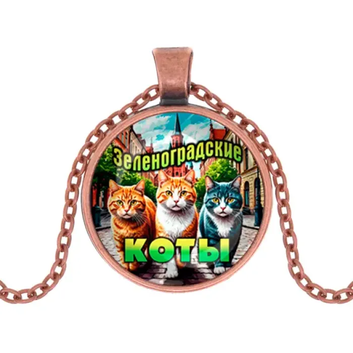 Кулон из бижутерного сплава с покрытием под медь и стеклянным элементом, изображающий зеленоградских котов.