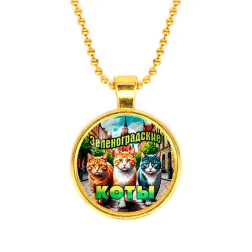Кулон с цепочкой из бижутерного сплава с золотым покрытием и стеклянной линзой. Дизайн с изображением зеленоградских котов.