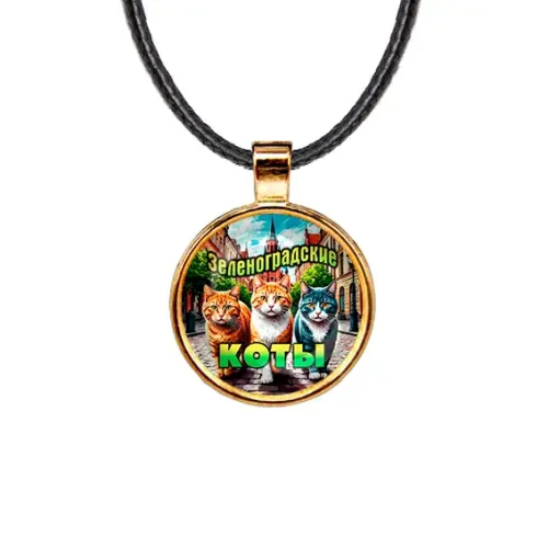Кулон из бижутерного сплава с изображением зеленоградских котов. Дизайн включает выпуклую стеклянную линзу и покрытие под золото.