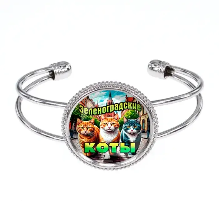 Металлический браслет с символикой Зеленоградских котов и стеклянной вставкой.