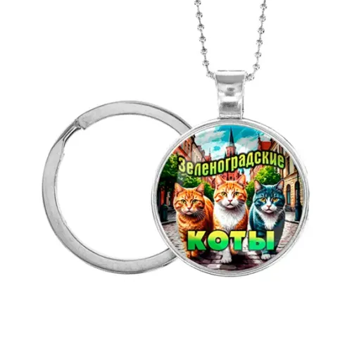 Кулон-брелок с изображением зеленоградских котов. Изделие выполнено из бижутерного сплава с серебристым покрытием и стеклянной линзой.