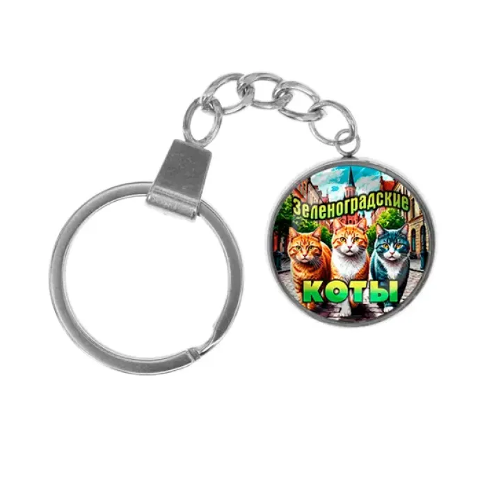 Брелок из нержавеющей стали с изображением Зеленоградских котов и кольцом для ключей.
