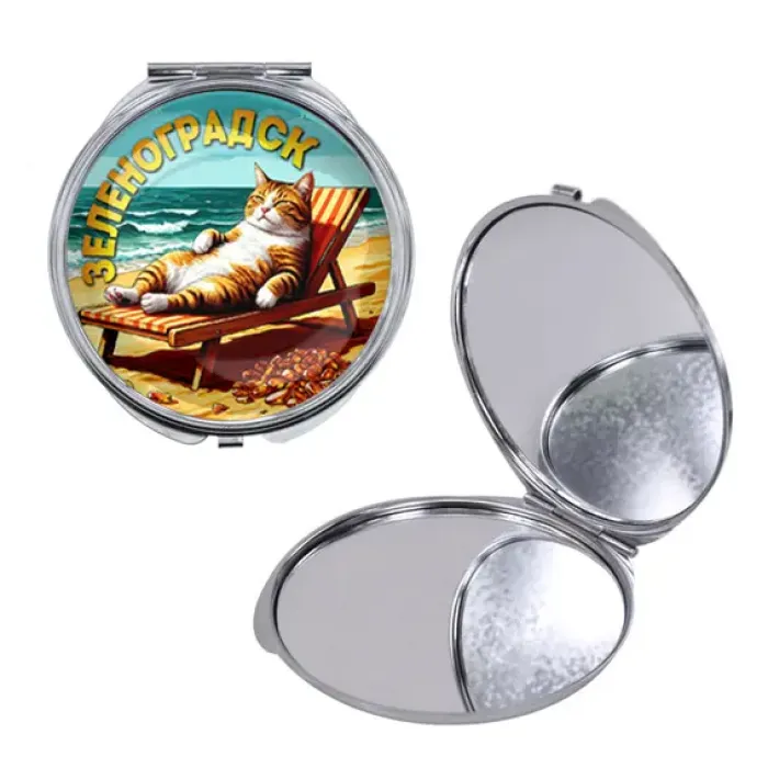 Складное зеркало круглой формы из металла и стекла с полноцветным изображением.