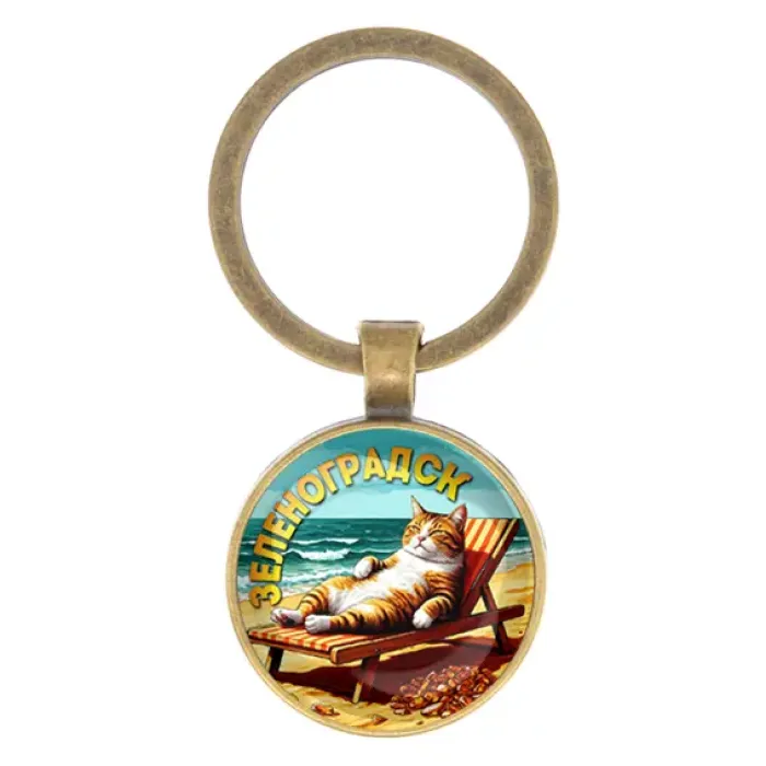 Круглый брелок для ключей из бижутерного сплава с покрытием под бронзу и стеклянной линзой, с изображением Зеленоградска.