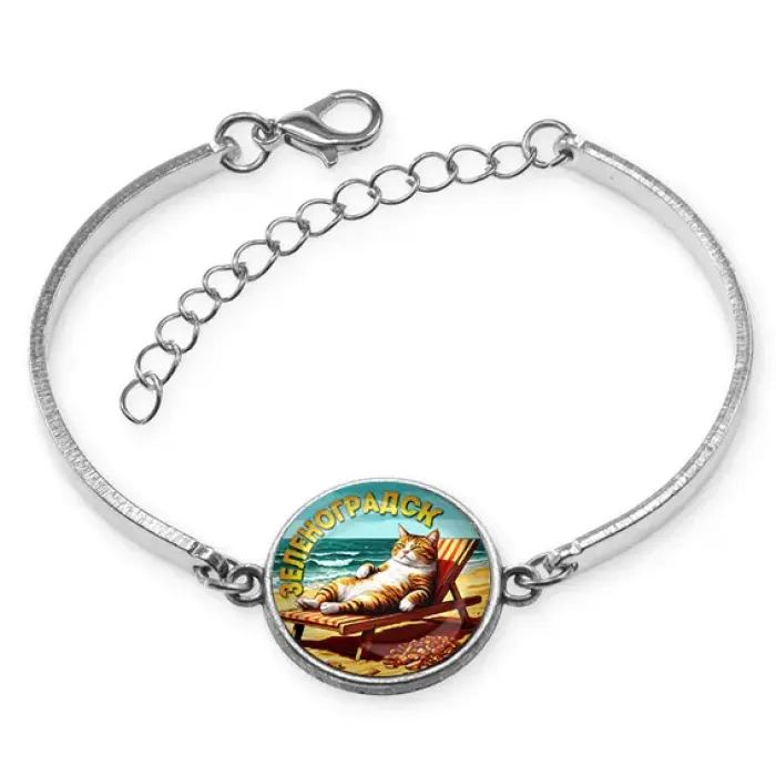 Браслет из бижутерного сплава с декоративным элементом под стеклянной линзой.