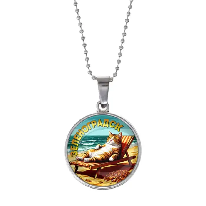 Сувенирный кулон с изображением города Зеленоградск. Материал — бижутерный сплав и стекло, цвет серебристый.