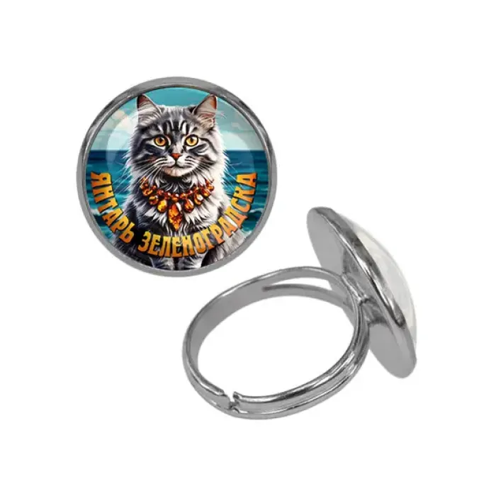 Безразмерное кольцо из бижутерного сплава с изображением под выпуклой стеклянной линзой.