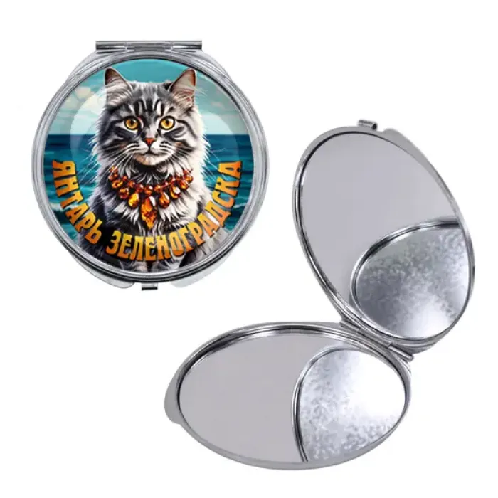 Складное зеркало круглой формы из металла и стекла с полноцветным изображением на поверхности.