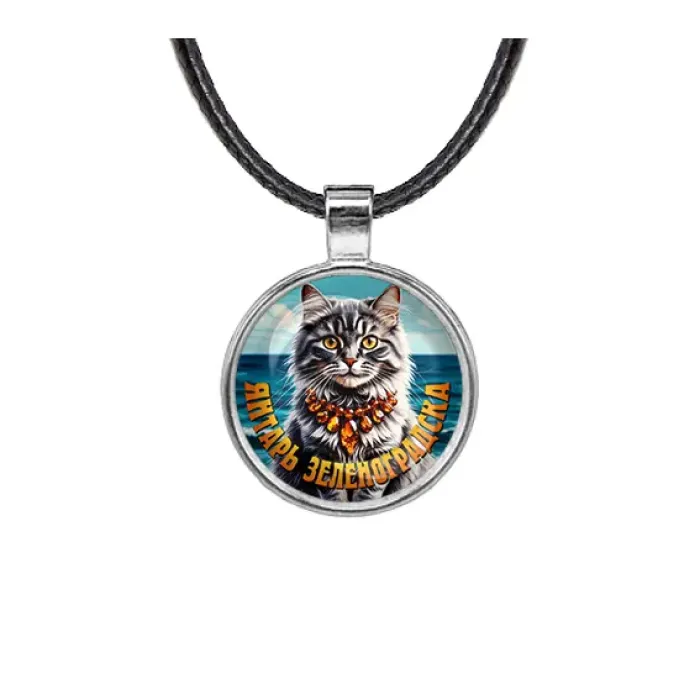Кулон с изображением янтаря из Зеленоградска. Изготовлен из бижутерного сплава с серебряным покрытием и стекла.