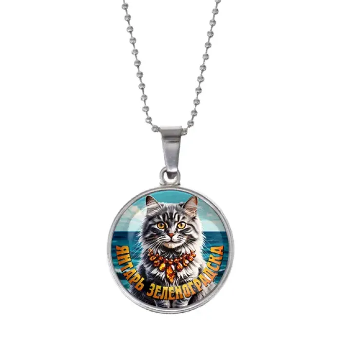 Кулон из бижутерного сплава с серебристым покрытием и стеклянной линзой, с регулируемой цепочкой.
