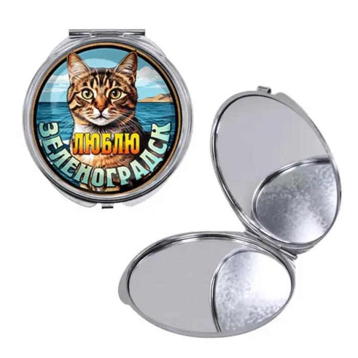 Складное зеркало круглой формы из металла и стекла с полноцветным принтом «Люблю Зеленоградск».