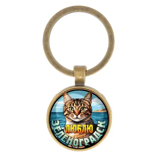 Круглый брелок-сувенир из бижутерного сплава с изображением «Люблю Зеленоградск» и стеклянной линзой.