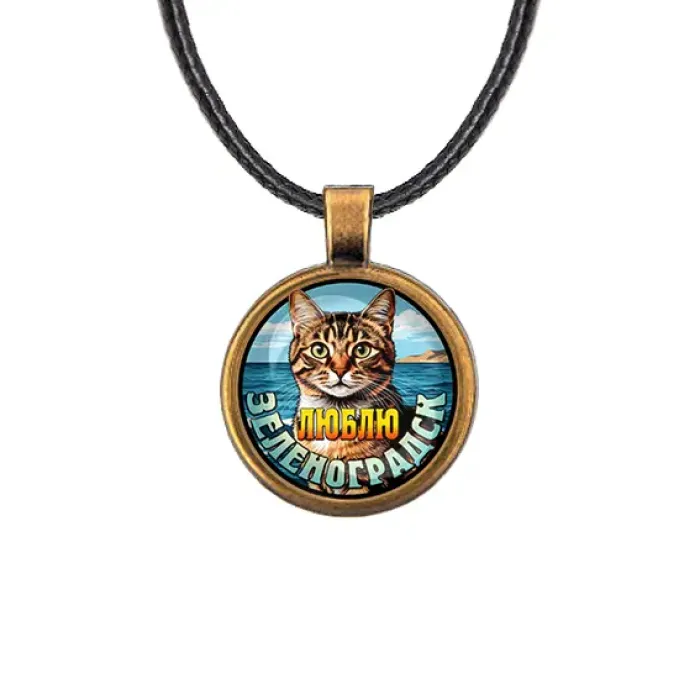 Сувенирный кулон с изображением города Зеленоградск. Изготовлен из бижутерного сплава с бронзовым покрытием и стеклянной линзой.