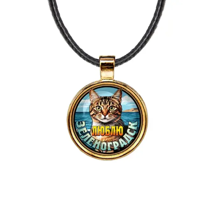 Сувенирный кулон с изображением города Зеленоградск. Изготовлен из бижутерного сплава с золотым покрытием и стеклянной линзой.