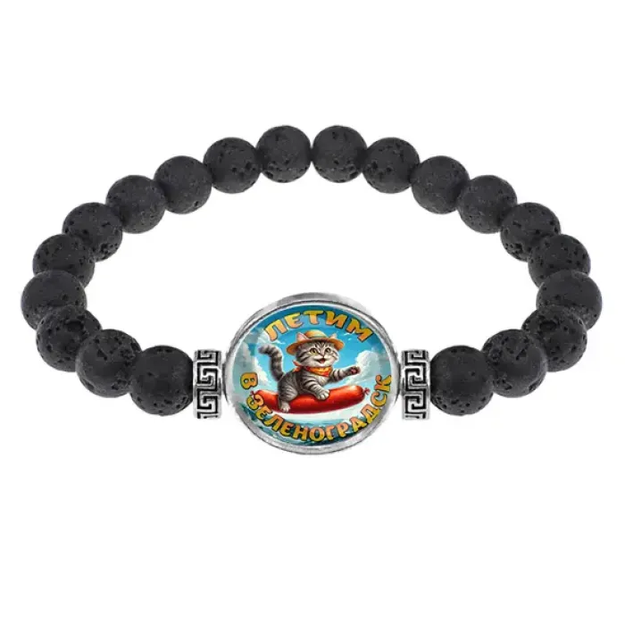 Стрейч-браслет из натуральной лавы с бусиной диаметром 8 мм, содержащей изображение под выпуклой стеклянной линзой.
