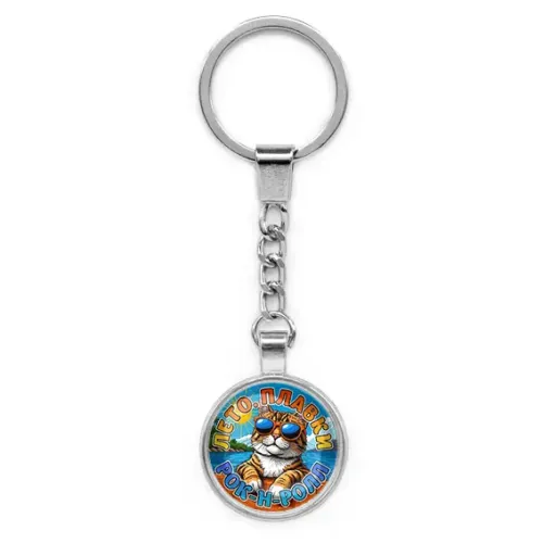 Круглый брелок из бижутерного сплава с покрытием под серебро и стеклянной линзой в тематике «Лето. Плавки. Рок-н-ролл».