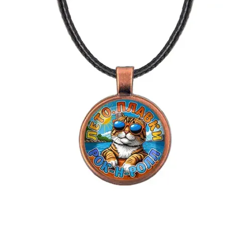 Кулон из бижутерного сплава с покрытием под медь и стеклянной линзой, дизайн в стиле рок-н-ролл с летней тематикой.