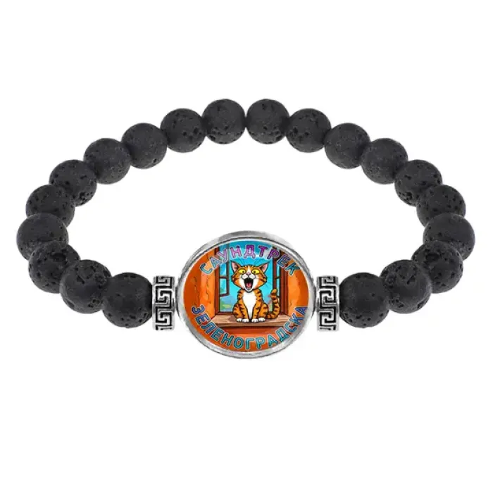 Стрейч-браслет из натуральной лавы диаметром 8 мм с изображением под выпуклой стеклянной линзой. Внутренний диаметр ~5,5 см. Изготовлен из лавы, бижутерного сплава с покрытием под серебро и стекла. Натуральный камень лава ценится за свои свойства впитывать эфирные масла, что делает его идеальным для аромабижутерии. Для активации аромабраслета достаточно нанести несколько капель эфирного масла на бусины, позволяя создавать уникальные ароматические композиции. Этот аксессуар не только стильный, но и функциональный.