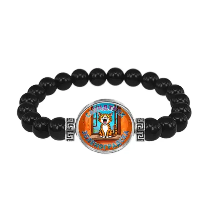 Стрейч-браслет из натурального чёрного агата с декоративным элементом под стеклянной линзой.
