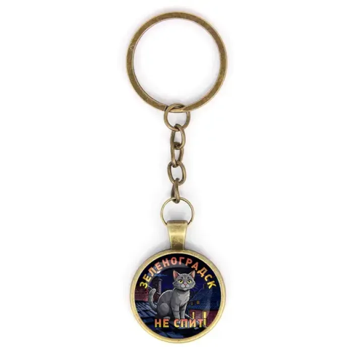 Брелок круглой формы с изображением «Зеленоградск не спит». Материал — бижутерный сплав с бронзовым покрытием и стеклом.